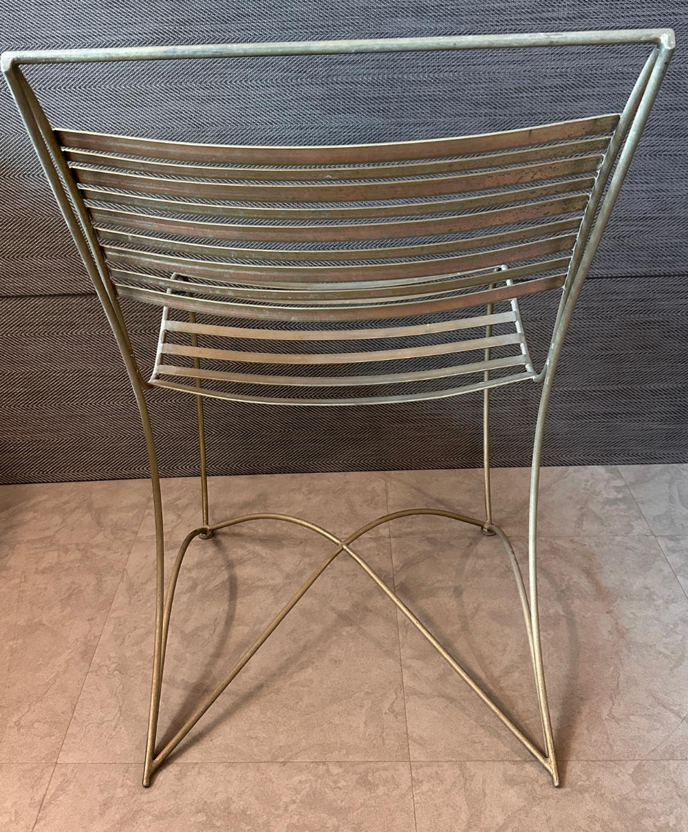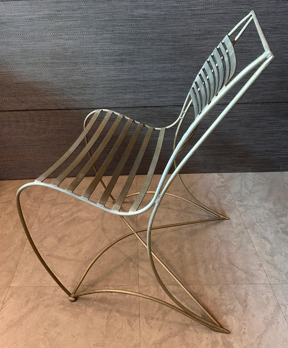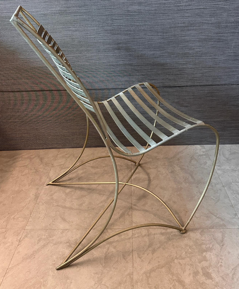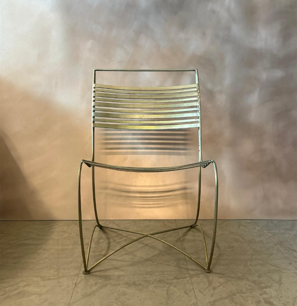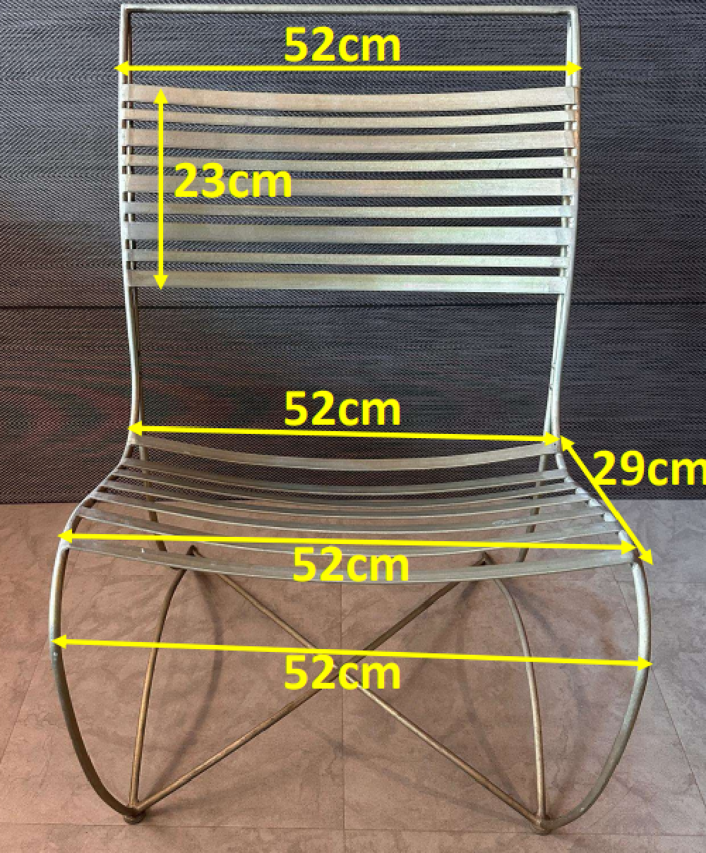 This sculptural metal chair features slim horizontal slats and a curved base with a slight rocking feature. Handcrafted by an Australian artist, this is a one-of-a-kind in the world piece designed for both style and comfort. Suitable for outdoor use, making it perfect for patios, gardens, or unique seating areas.