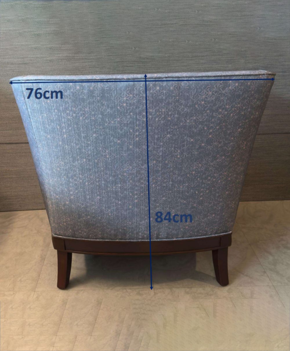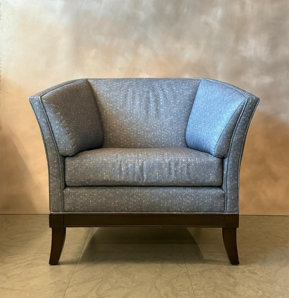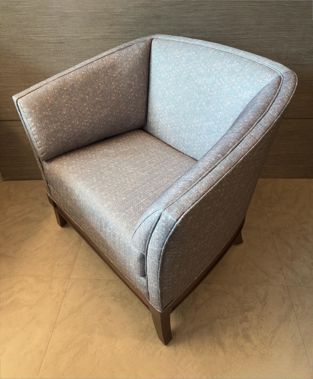 This compact armchair features a gently curved backrest and smooth, fabric-covered frame with a subtle geometric pattern. Supported by a sturdy wooden base with a warm finish, it offers both comfort and elegance. Most ideal to use in indoor settings like living rooms, reading corners, or lounge areas.