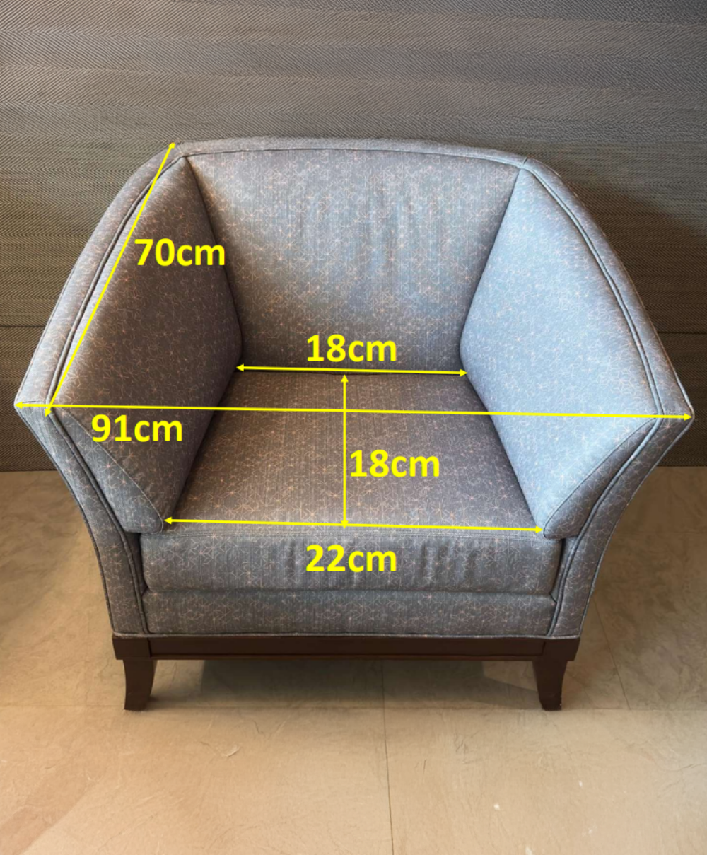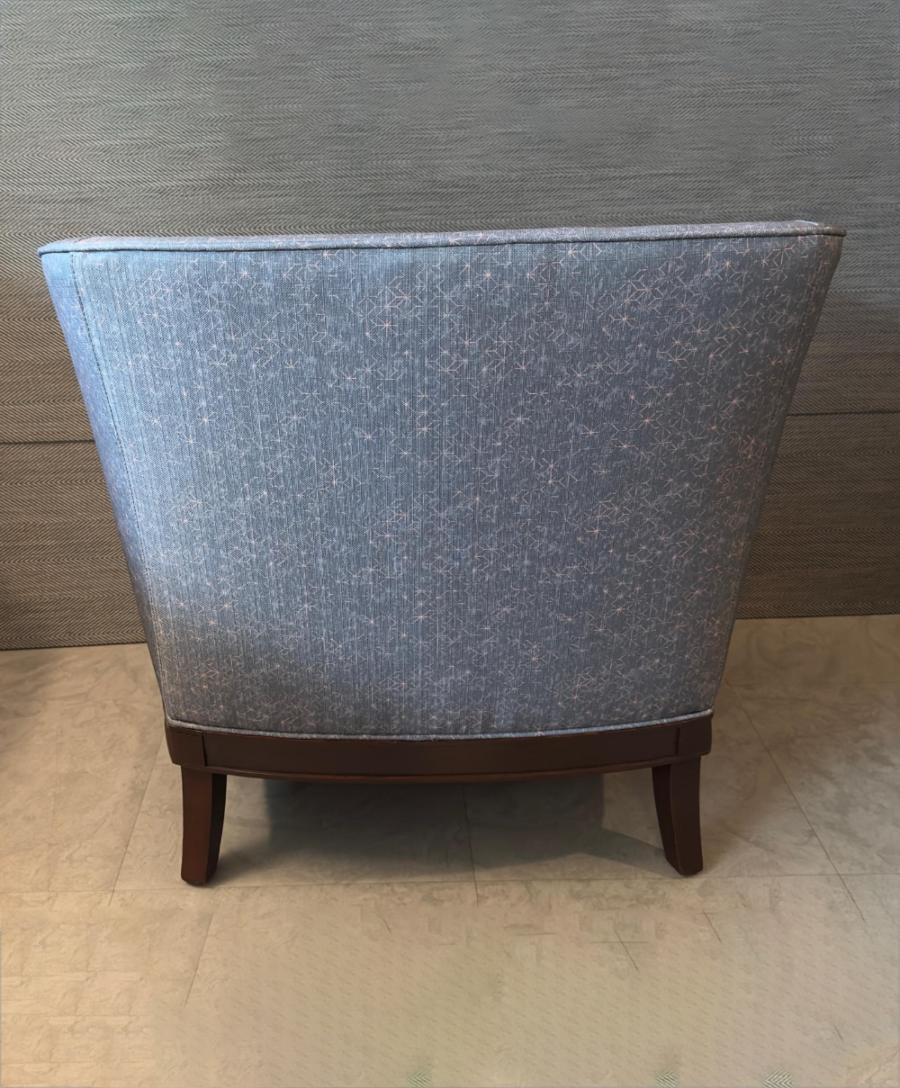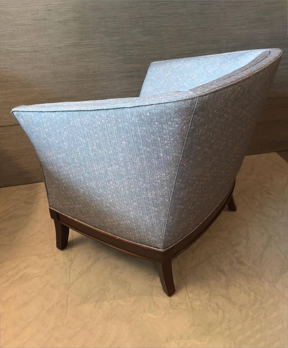 This compact armchair features a gently curved backrest and smooth, fabric-covered frame with a subtle geometric pattern. Supported by a sturdy wooden base with a warm finish, it offers both comfort and elegance. Most ideal to use in indoor settings like living rooms, reading corners, or lounge areas.