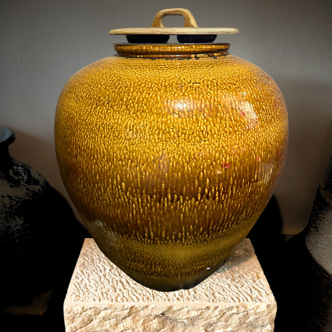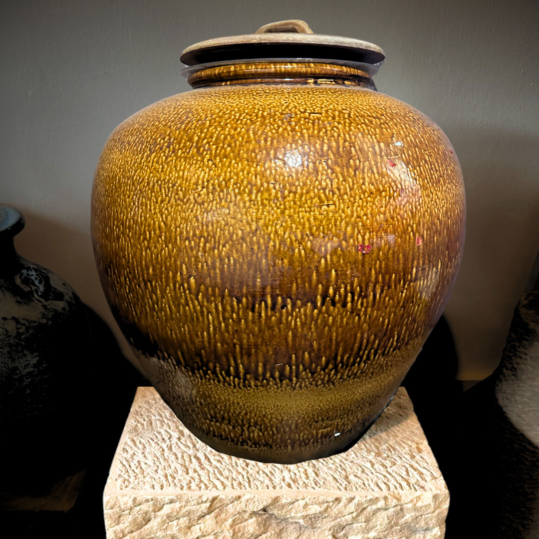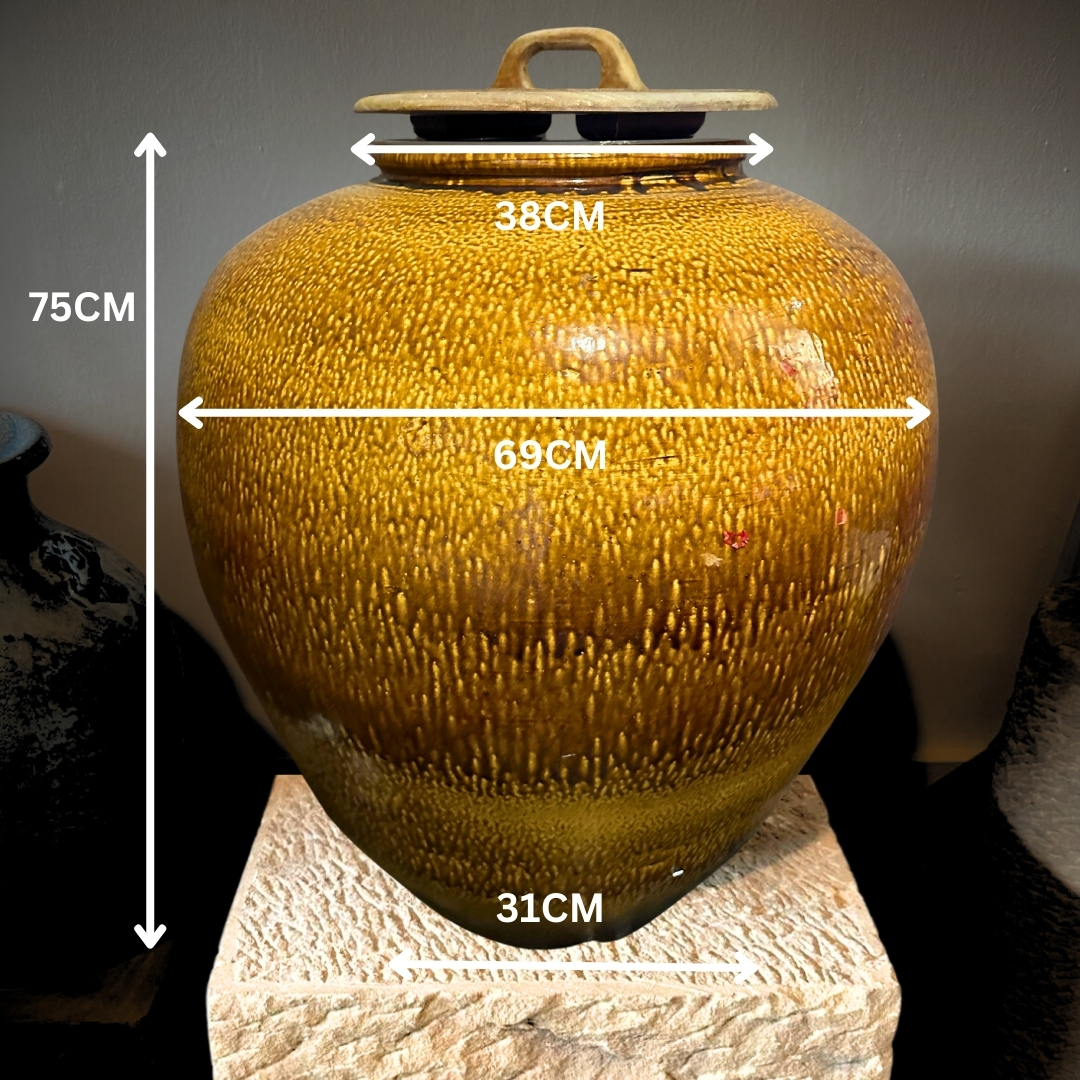This large golden ceramic jar features a smooth, rounded silhouette and a textured drip-glaze finish. Suitable for indoor or outdoor use and has no drain hole.