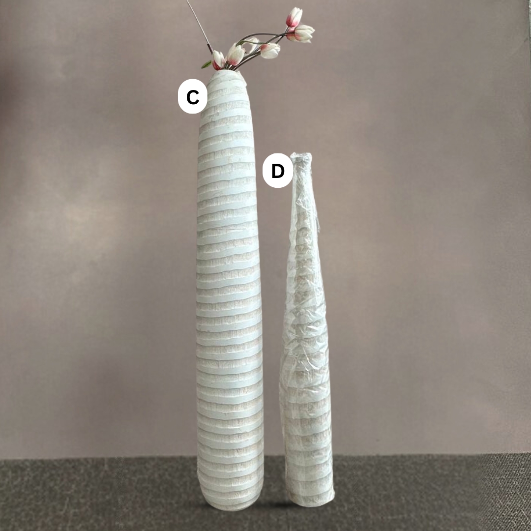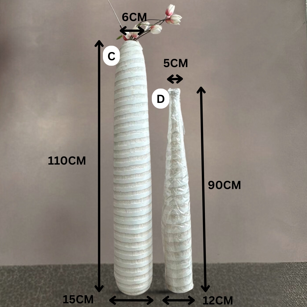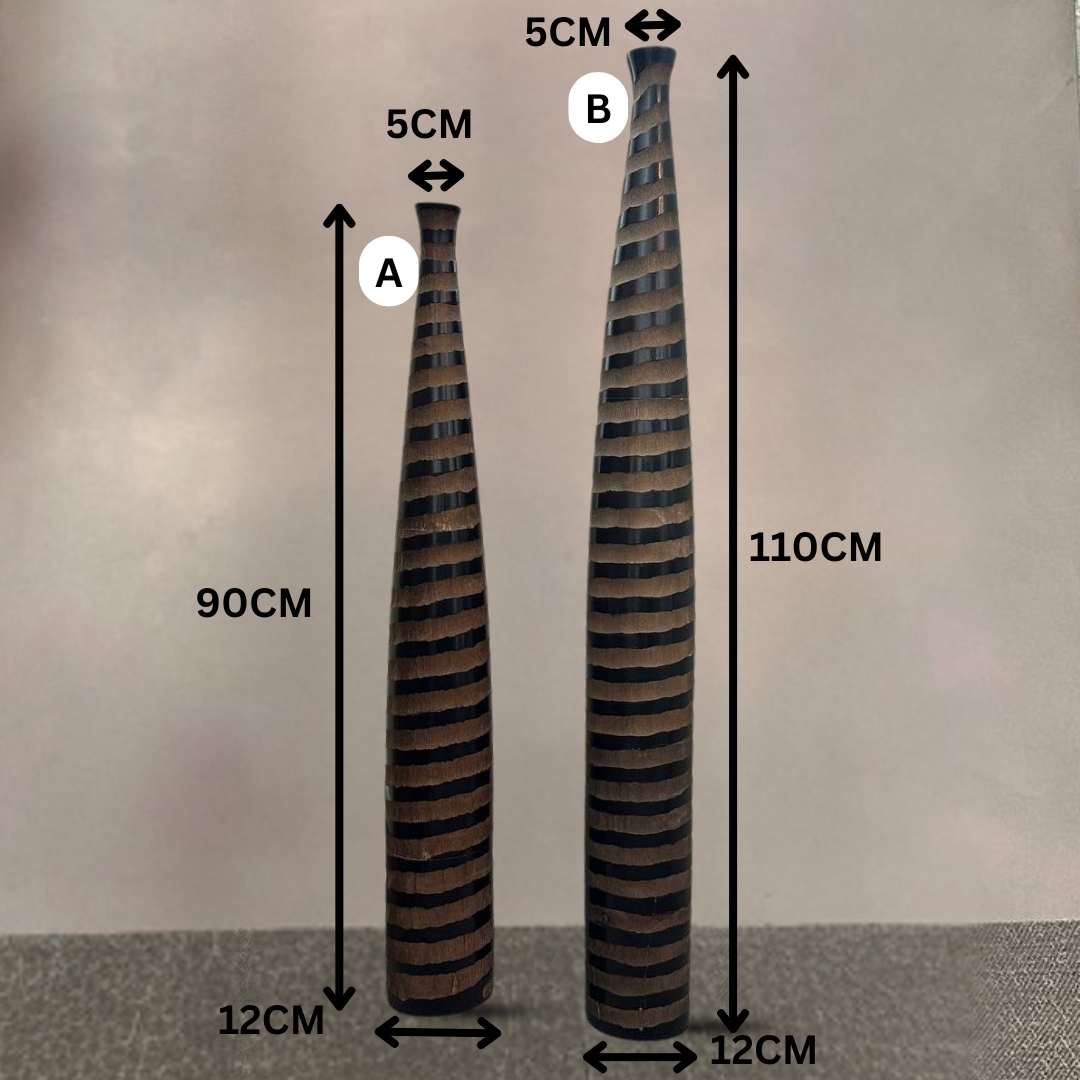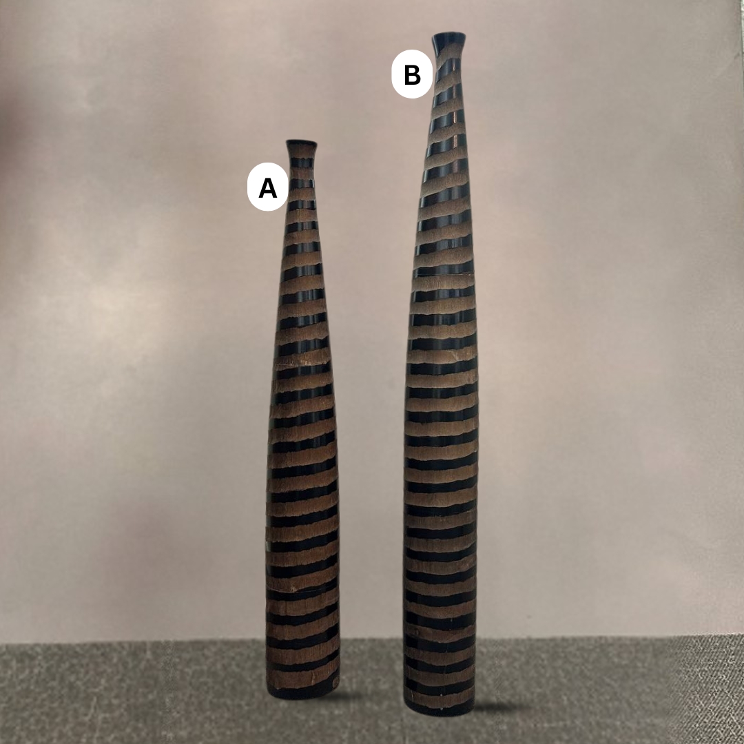 These handcrafted vases, made from sustainable mango wood, feature a ribbed design and natural wood grain patterns. Ideal for displaying flowers or decorative pieces.