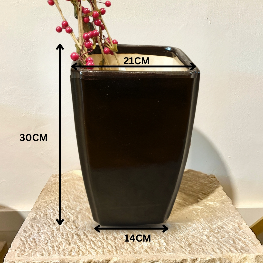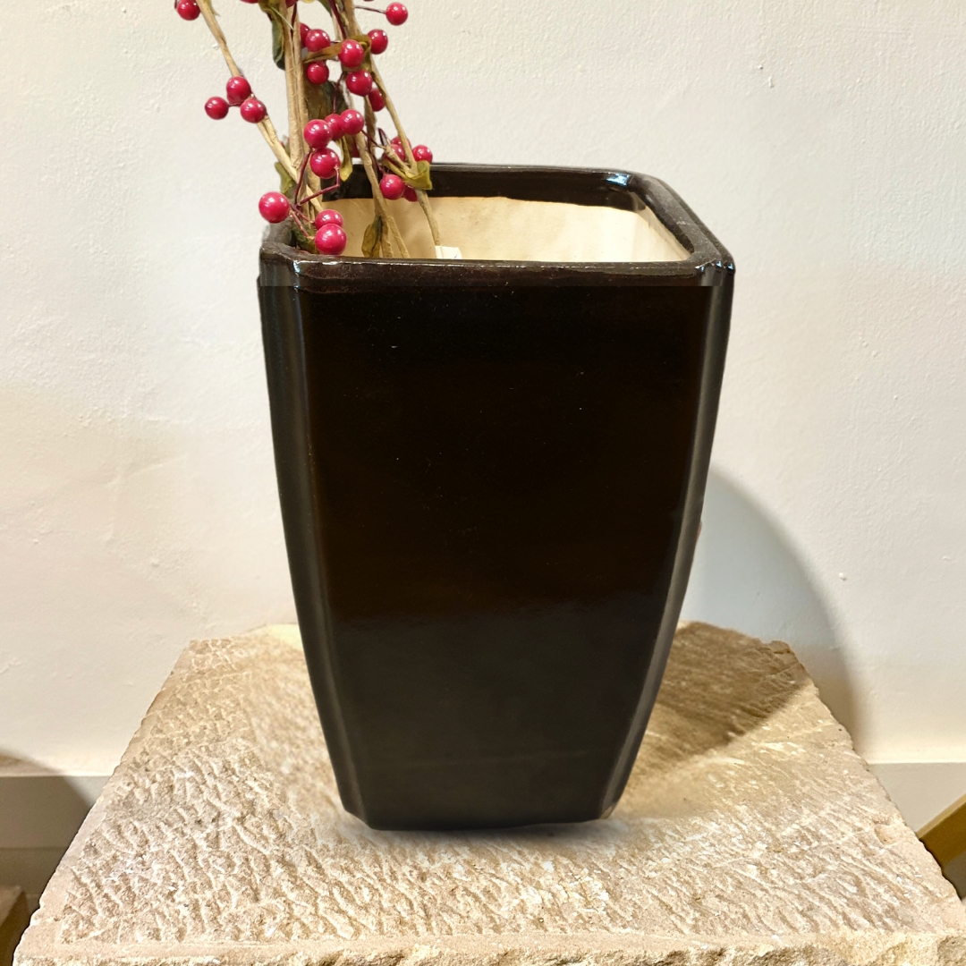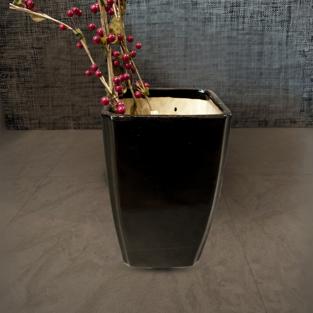 This medium glossy black vase features a modern square design. Suitable for both indoor and outdoor use and includes a drain hole.