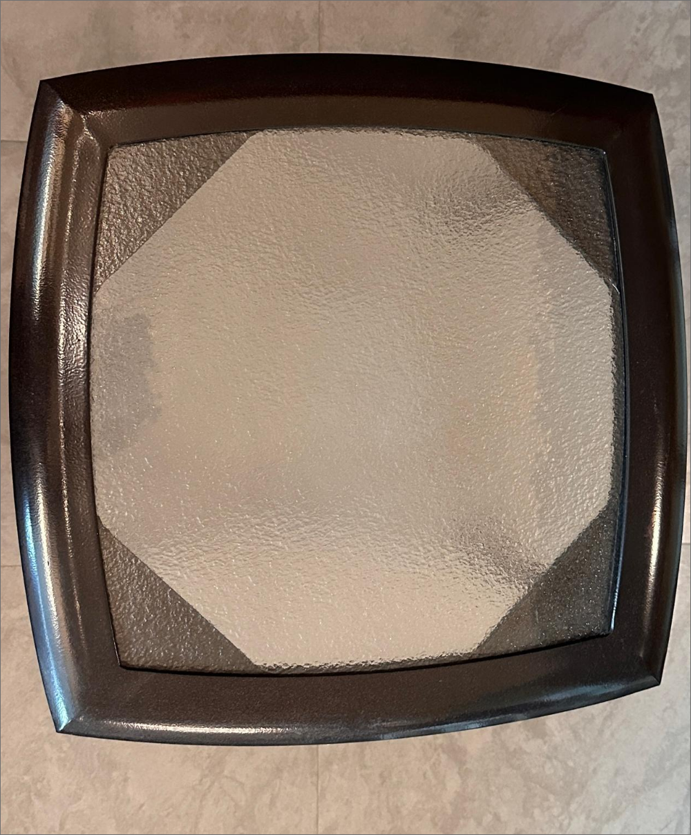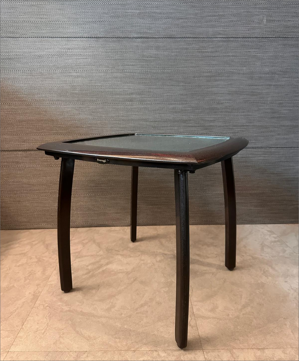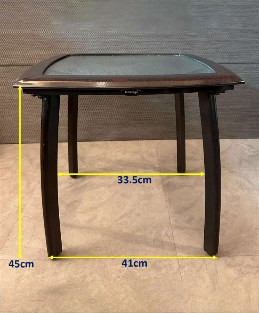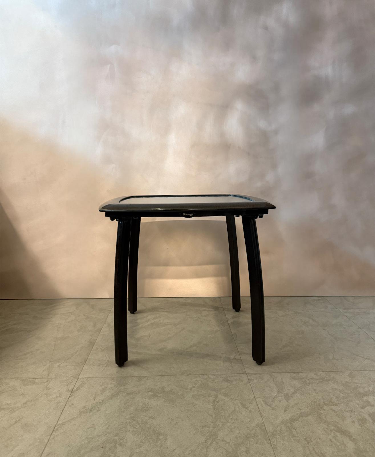 Square glass-top side table by Nouvage, featuring a sturdy dark-toned powder-coated frame and gently curved legs. Compact and versatile, perfect for indoor or outdoor use as a coffee, patio, or accent table.