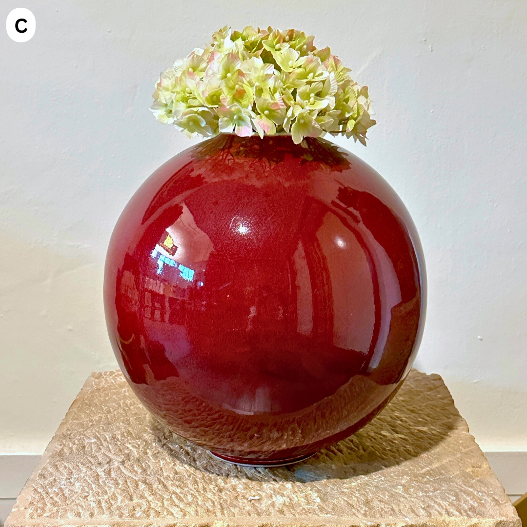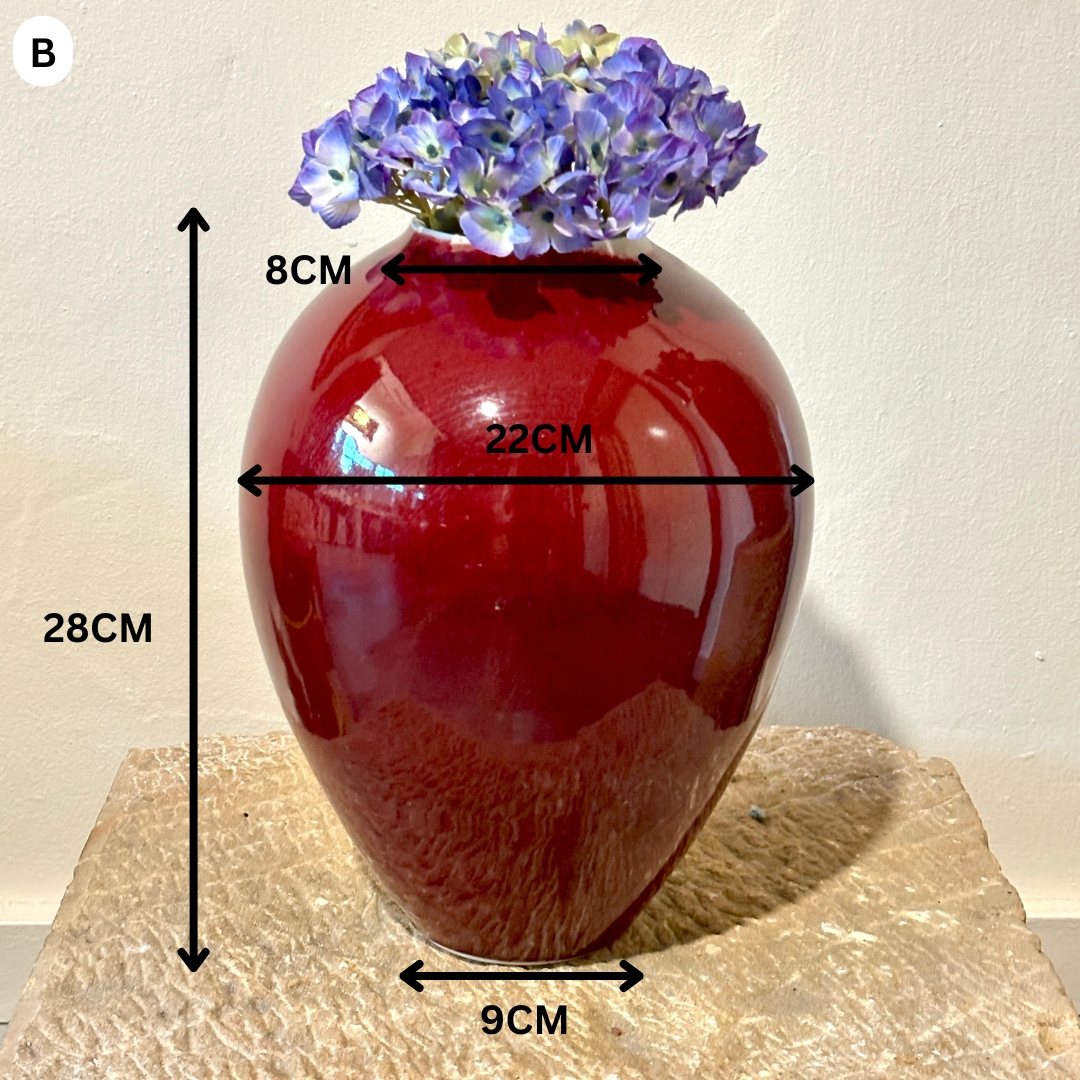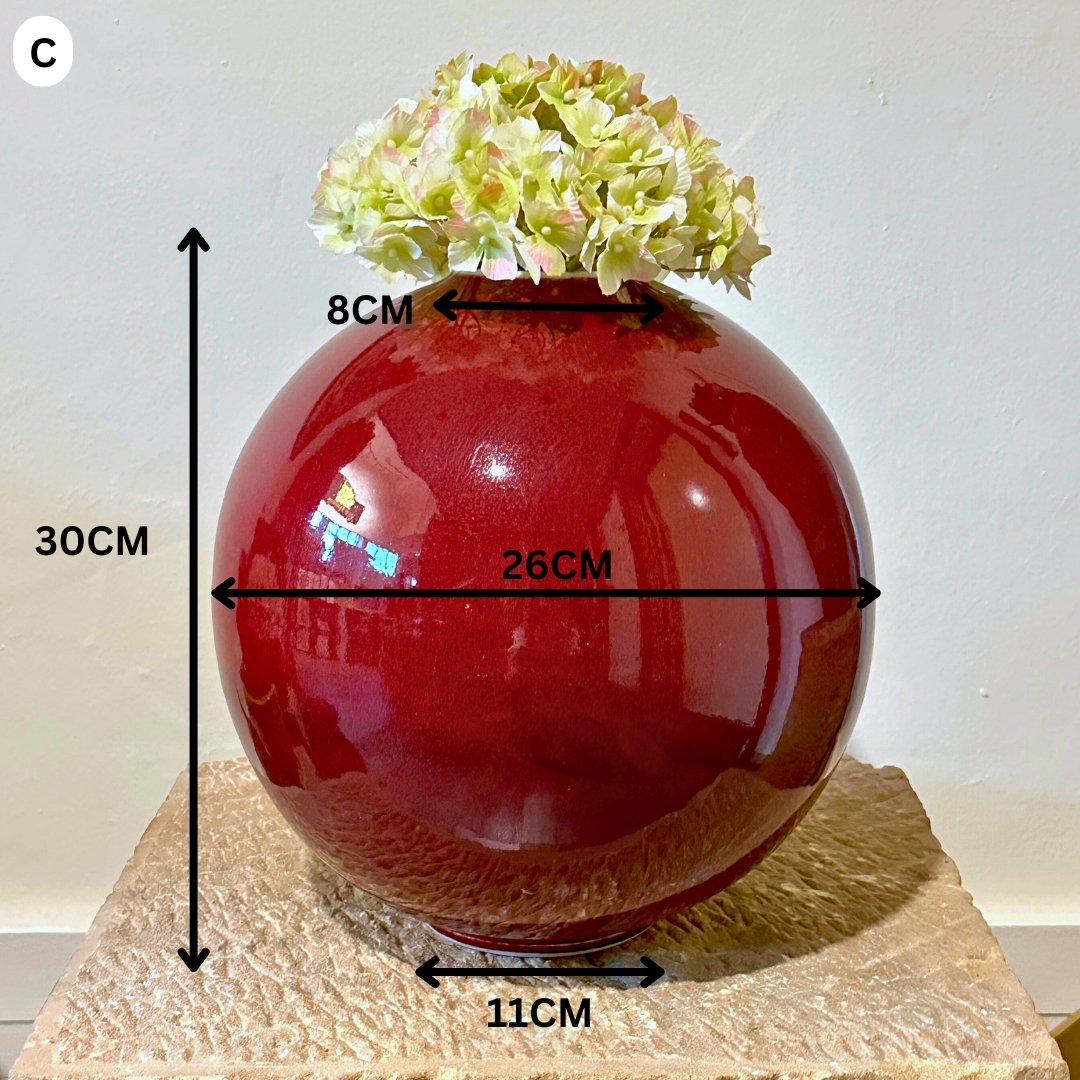 This set of handcrafted ornament jars from Australia features a glossy finish in a deep crimson hue. It does not include a drain hole.