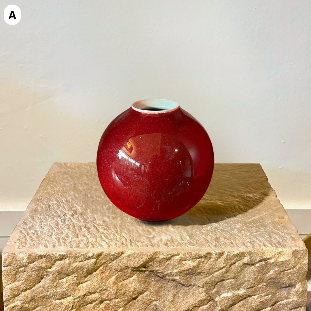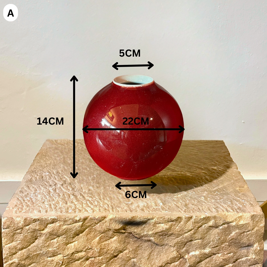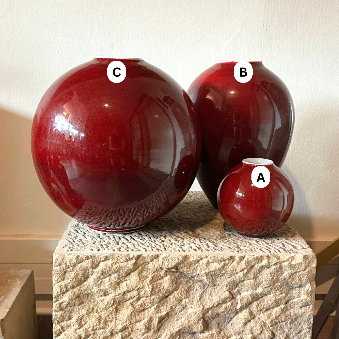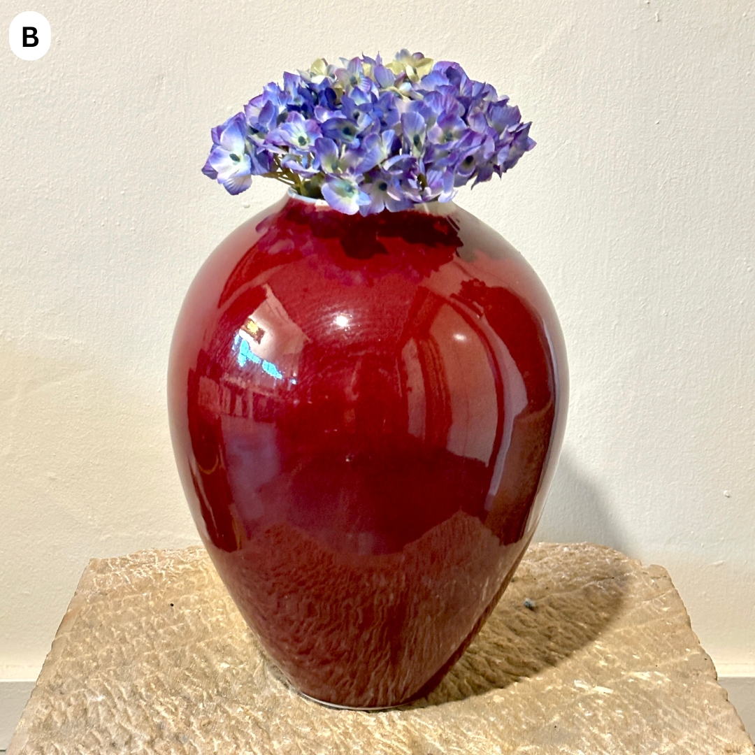 This set of handcrafted ornament jars from Australia features a glossy finish in a deep crimson hue. It does not include a drain hole.