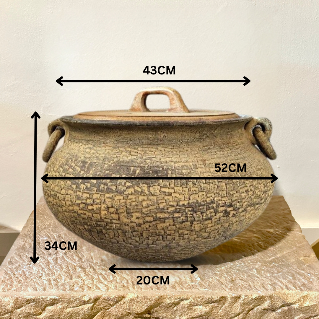 This rugged pot features a rough cracked-texture finish with rich earthy tones. Perfect for vintage décor. Wooden cover/lid sold separately for $50.