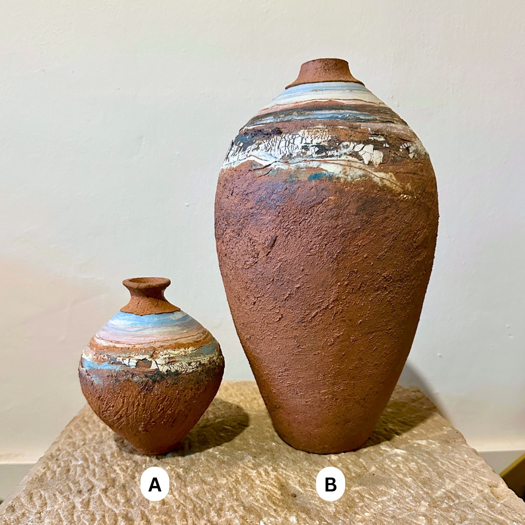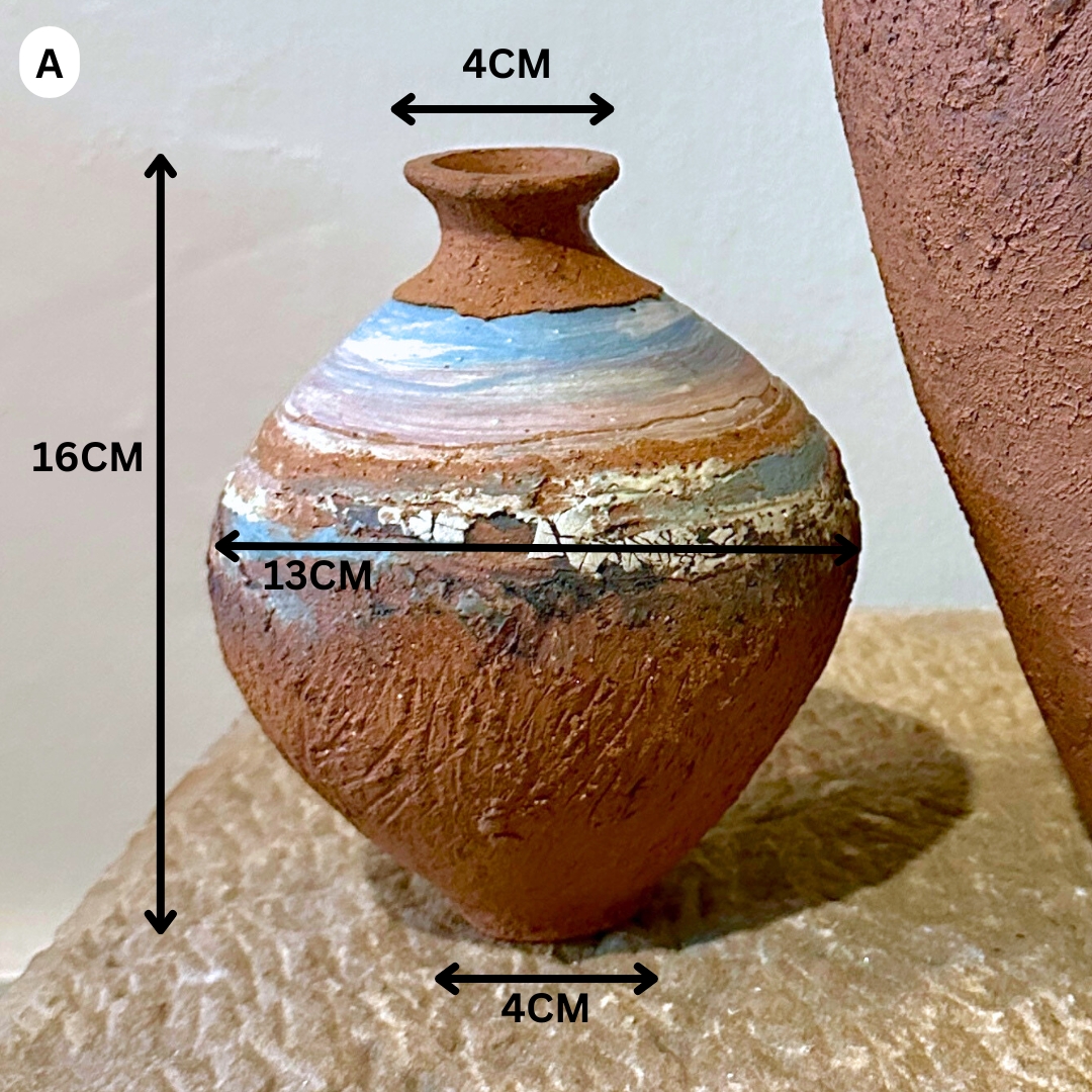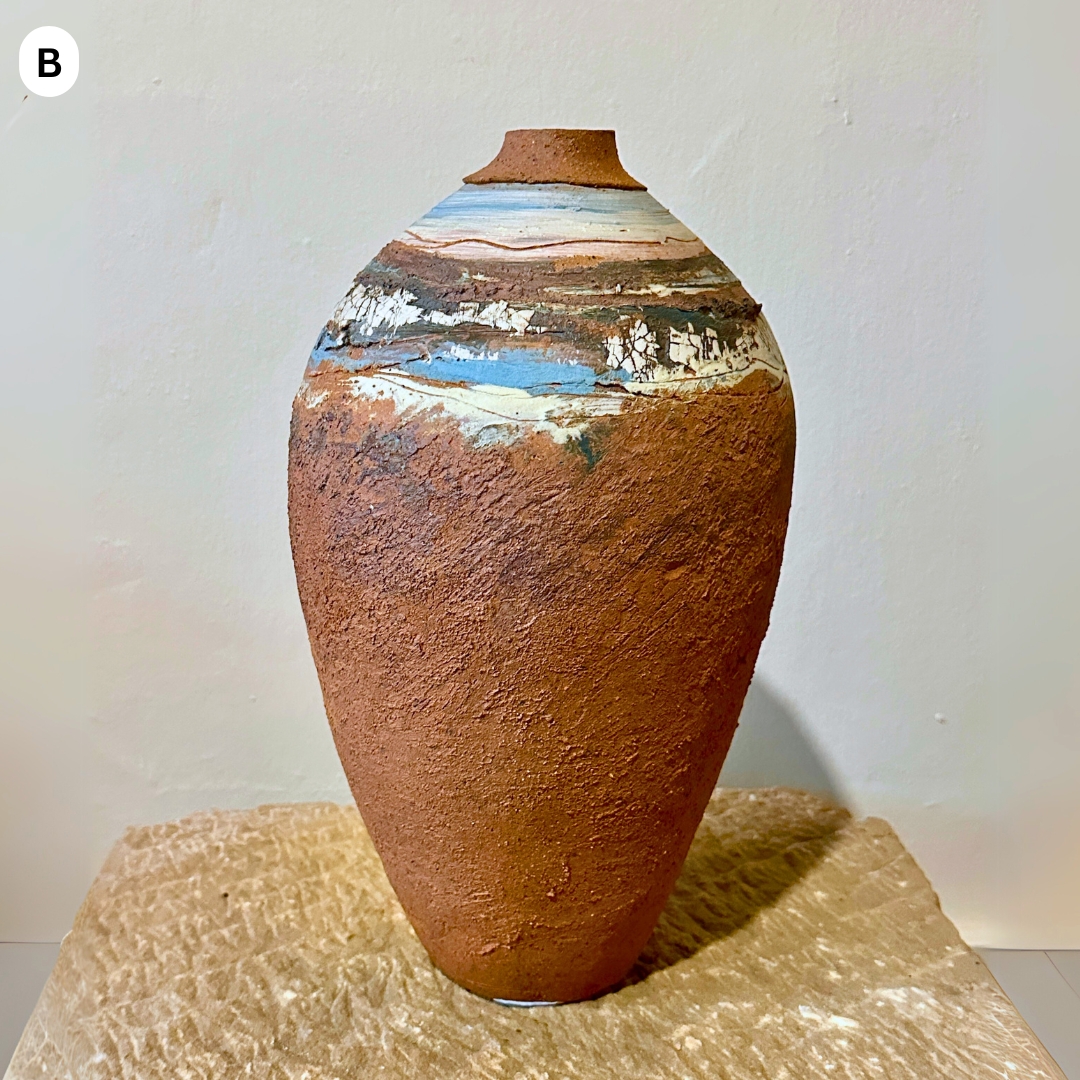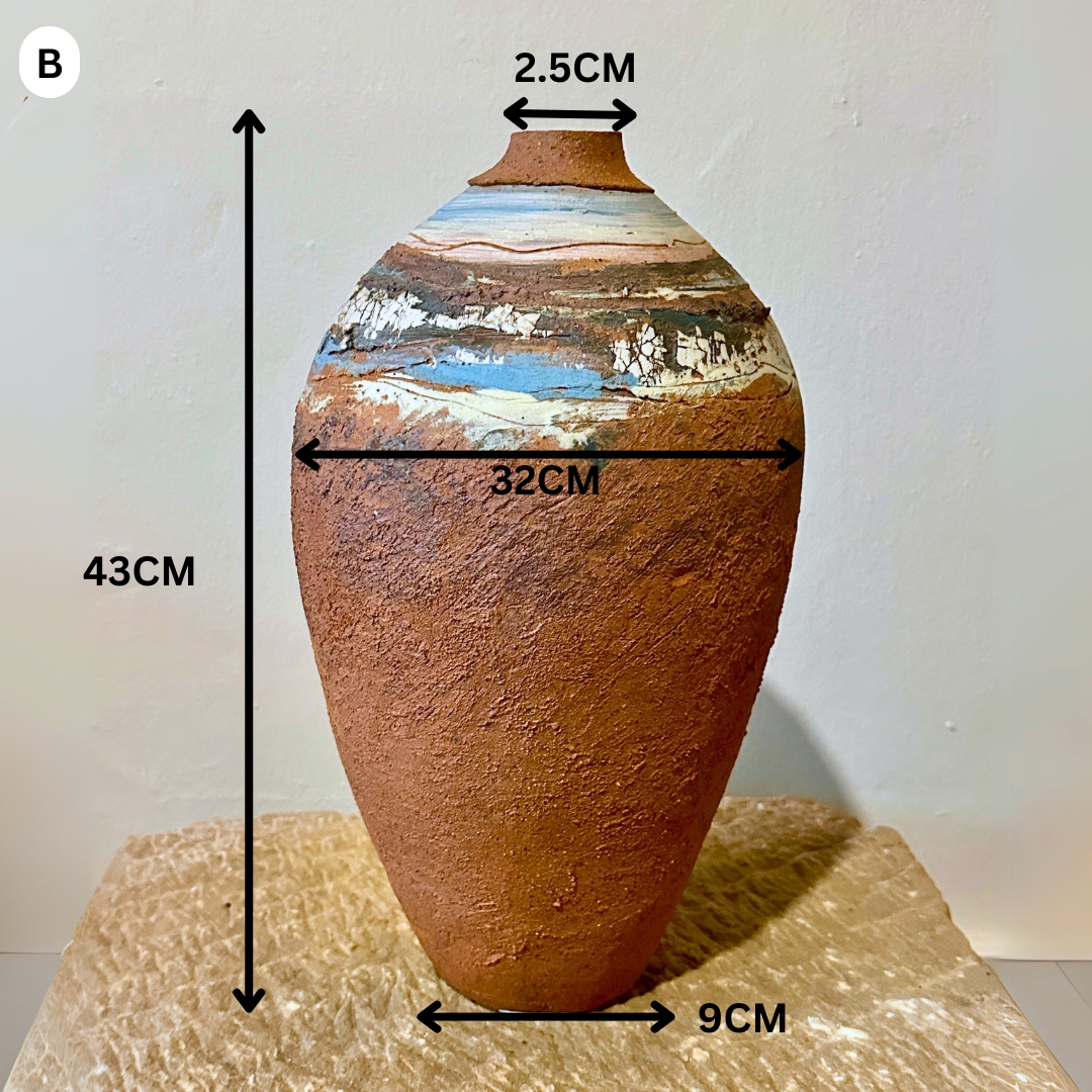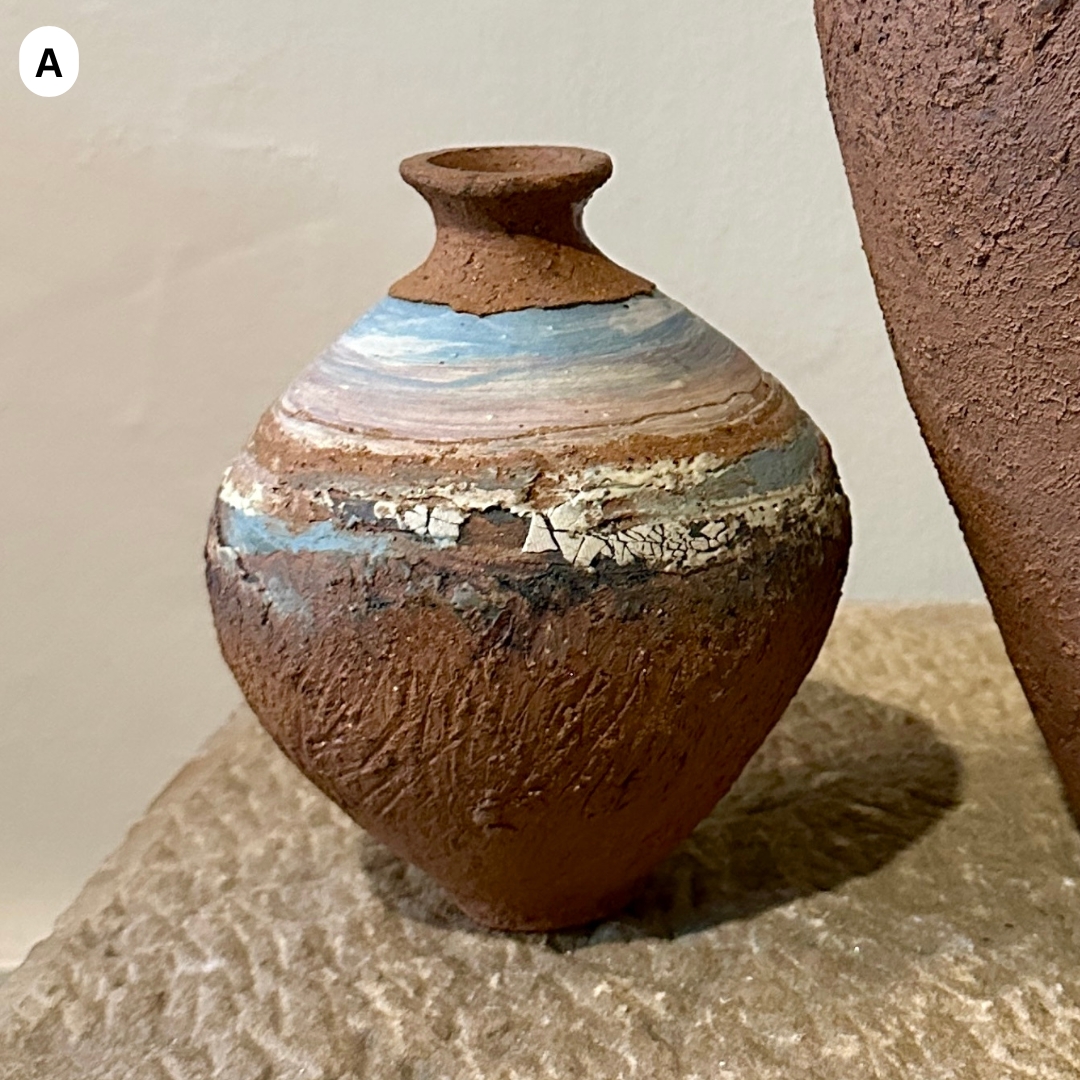 This hand-crafted ceramic vase features a rugged, textured surface and abstract patterns and does not include a drain hole.