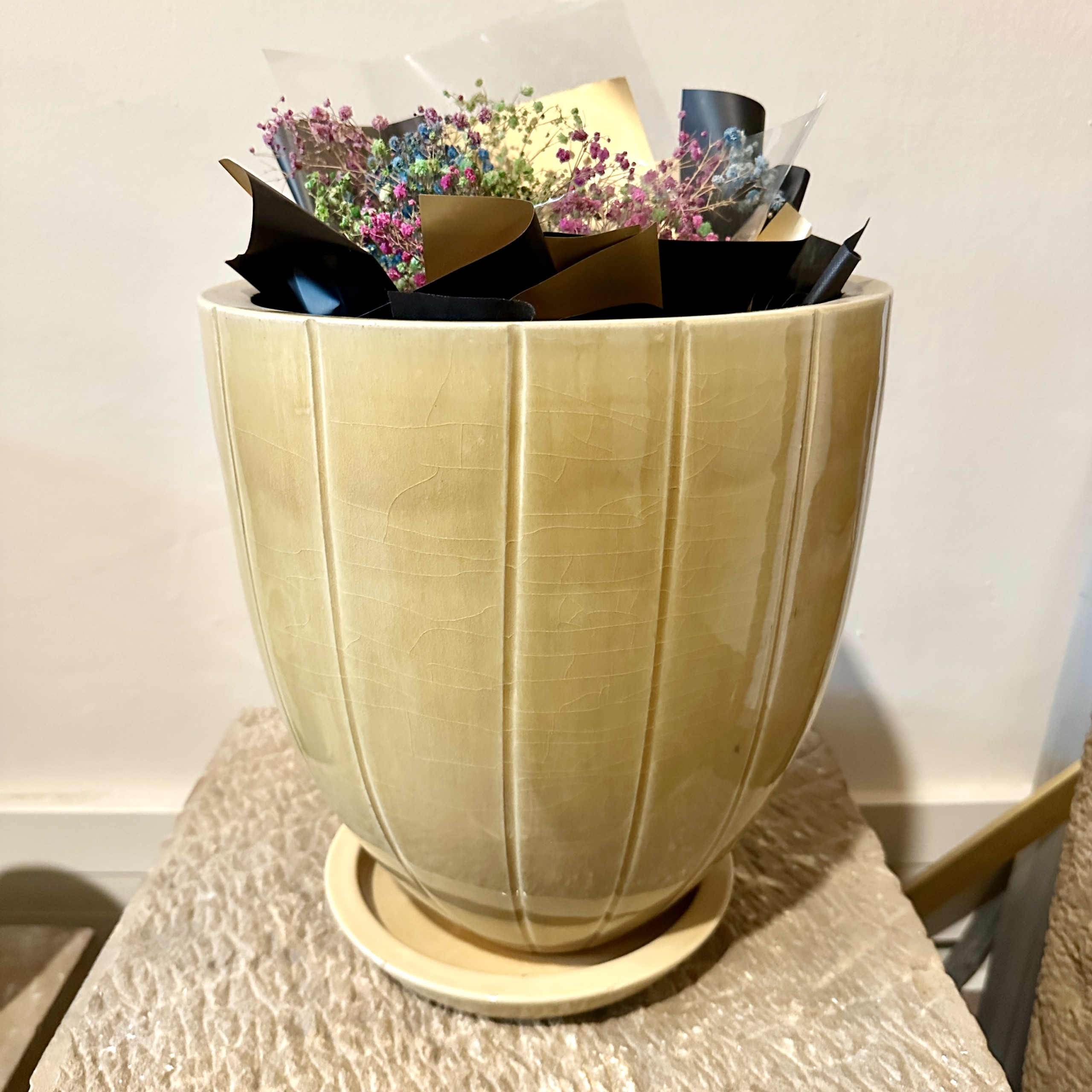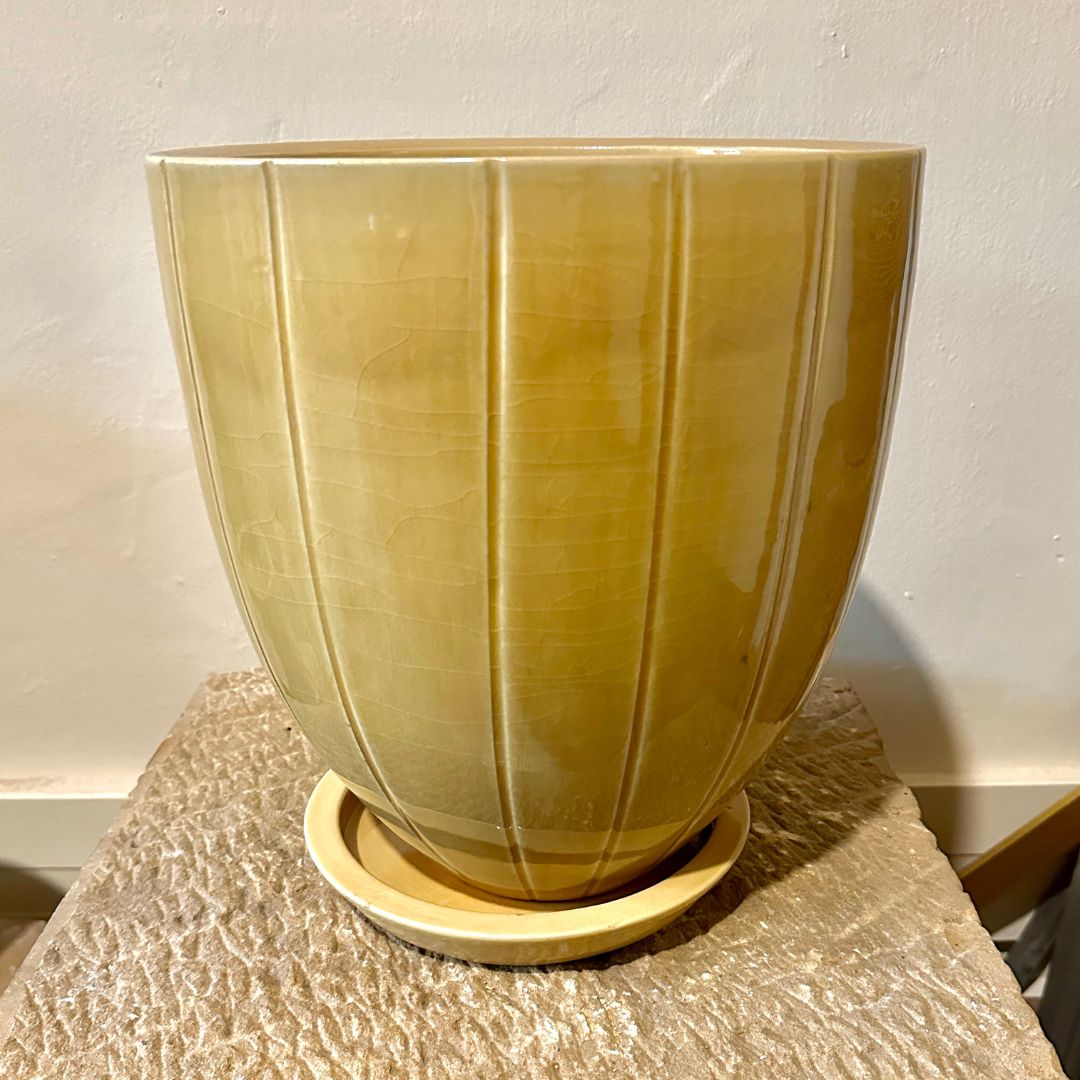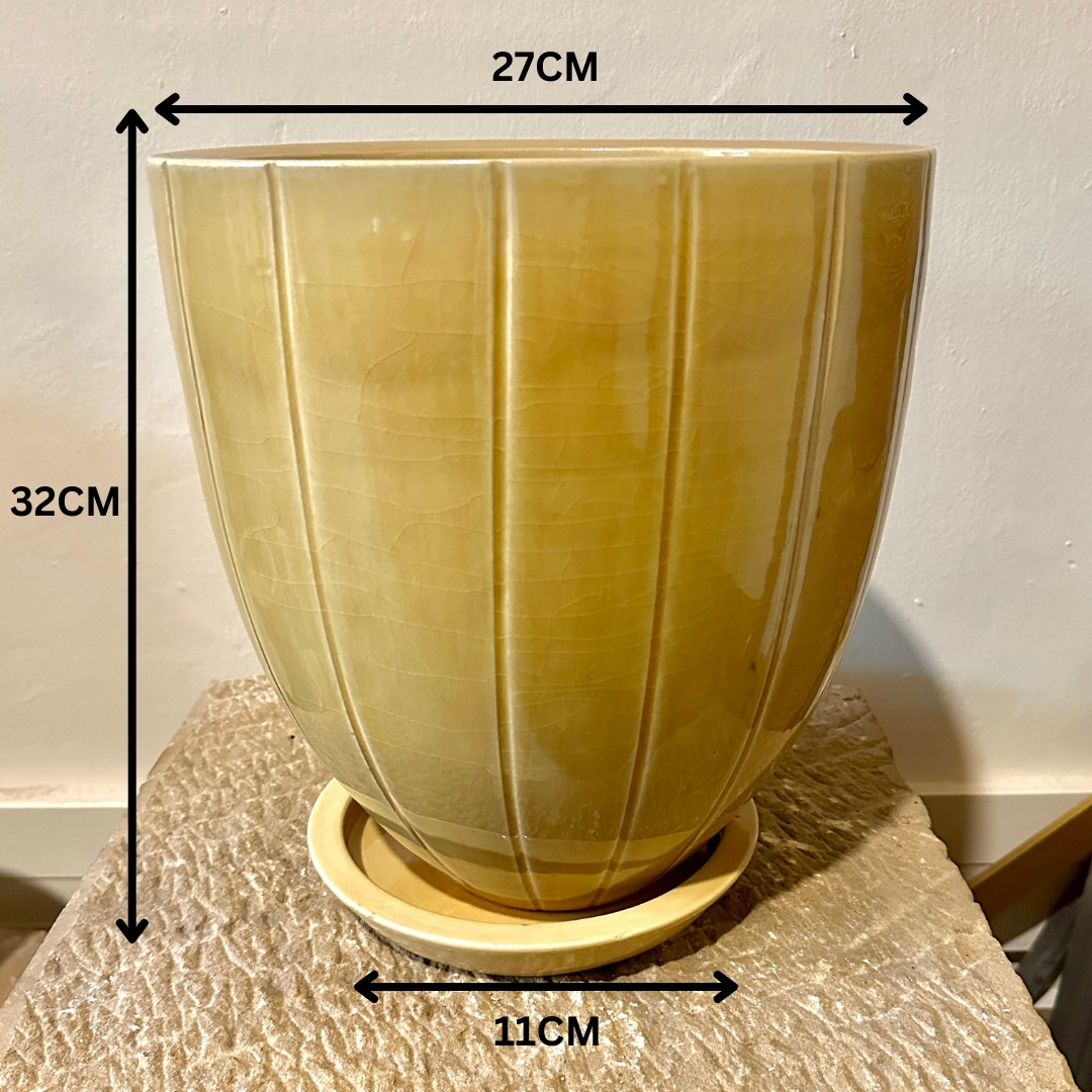 This warm honey finish pot features a drain hole and matching water collection dish, making it suitable for both indoor and outdoor use.